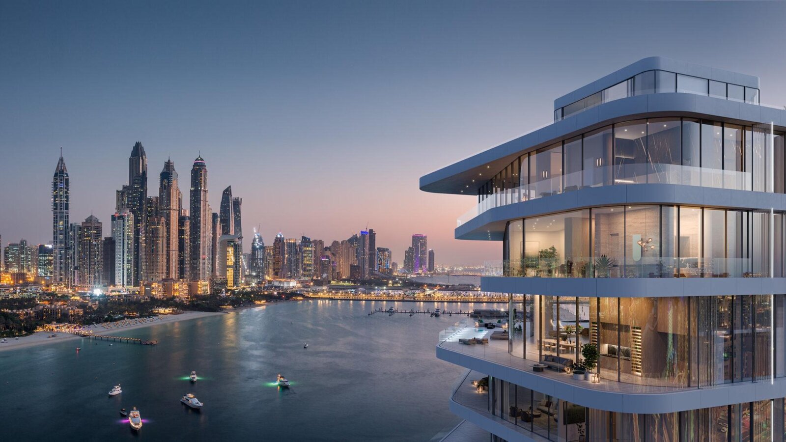 The four-storey mansions with panoramic windows are built in an arc on the peninsula, providing views of both the Persian Gulf and the marina.