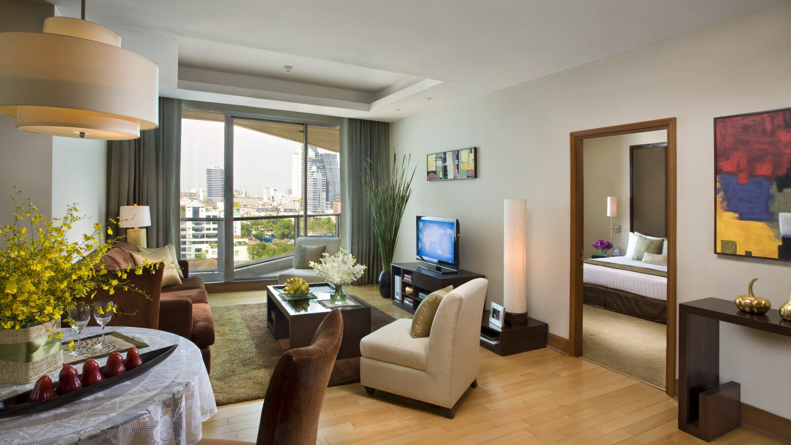 Светлые интерьеры, классическая обстановка, настоящий деревянный паркет и просторные двуспальные кровати: в этом комплексе апартаментов стиль сочетается с комфортом. В здании для постояльцев оборудован фитнес зал, лаундж под открытым небом и открытый бассейн с шикарным видом на закатный Бангкок.