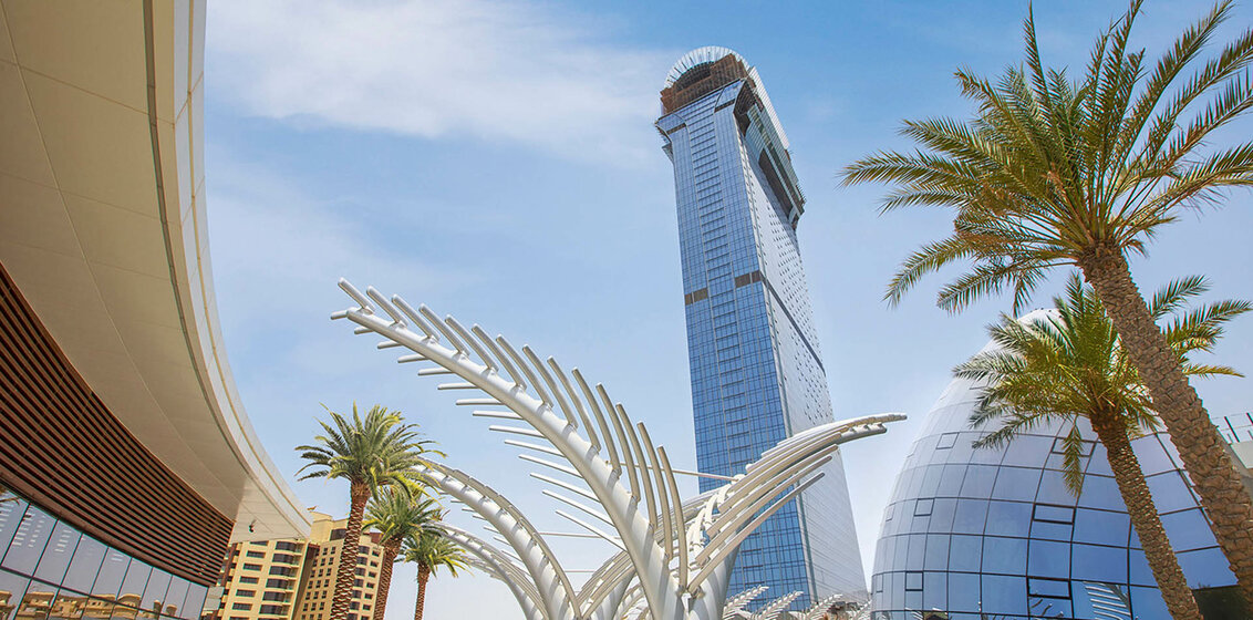 The Palm Tower — элитный жилой комплекс, который находится на известном искусственном архипелаге Palm Jumeirah. В этом месте есть всё, что нужно для комфортной жизни: торговые центры, продуктовые магазины, парки развлечений, кафе, рестораны, красивые виды. Школы и детские сады открыты в паре минут езды на машине.