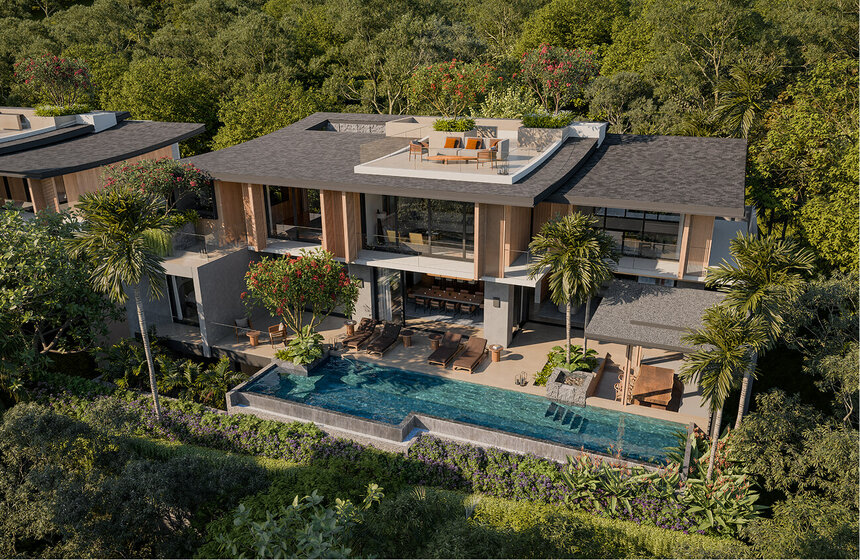Villa De Valley are modern pool villas seamlessly integrated into the tropical landscape. The floor-to-ceiling windows and well-appointed roofs with multifunctional spaces offer breathtaking vistas of the sea and the Bang Khon Thi village valley. The rooftop features an outdoor relaxation area with a barbecue and a wooden bench. The fence is adorned with trees, planted at a height that ensures complete privacy.